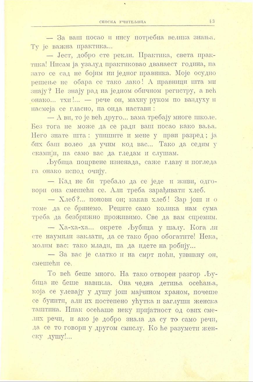 То већ беше много. На тако отворен разгор Љубица не беше навикла. Она, чедна детиња осећања, која се улевају у душу још мајчином храном, почеше се бунити, али их постепено ућутка и заглуши женска таштина. Ипак осећаше неку пријатност од ових смелих речи, и ако је добро знала да су то само речи, да се то говори у другом смислу. Ко ће разумети женску душу!...