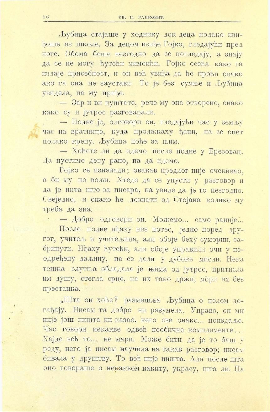 »Шта он хоће? размишља Љубица о целом догађају. Нисам га добро ни разумела. Управо, он ми није још ништа ни казао, него све онако... поиздаље. Час говори некакве одвећ необичне комплименте... Хајде већ то... не мари. Може бити да је то баш у реду, него ја нисам научила на такав разговор; нисам бивала у друштву. То већ није ништа. Али после шта оно говораше о некаквом накиту, украсу, шта ли. Па