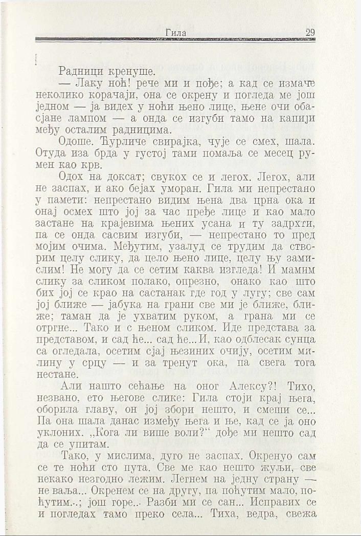 Одох на доксат; свукох се и легох. Легох, али не заспах, и ако бејах уморан. Гила ми непрестано у памети: непрестано видим њена два црна ока и онај осмех што јој за час пређе лице и као мало застане на крајевима њених усана и ту задрхти, па се онда сасвим изгуби, — непрестано то пред мојим очима. Међутим, узалуд се трудим да створим целу слику, да цело њено лице, целу њу замислим! Не могу да се сетим каква изгледа! И мамим слику за сликом полако, опрезно, онако као што бих јој се крао на састанак где год у лугу; све сам јој ближе — јабука на грани све ми је ближе, ближе; таман да је ухватим руком, а грана ми се отргне... Тако и с њеном сликом. Иде представа за представом, и сад ће... сад ће...И, као одблесак сунца са огледала, осетим сјај њезиних очију, осетим милину у срцу — и за тренут ока, па свега тога нестане.