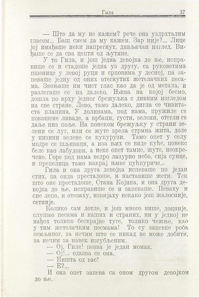 Гила и она друга девојка испеваше по један стих, па онда престадоше, и наставише жети. Тек што оне престадоше, Стана Којина, и она друга девојка до ње, исправише се и запеваше. Певаху и оне лепо, и отезаху, извијаху некако још жалосније, сетније.