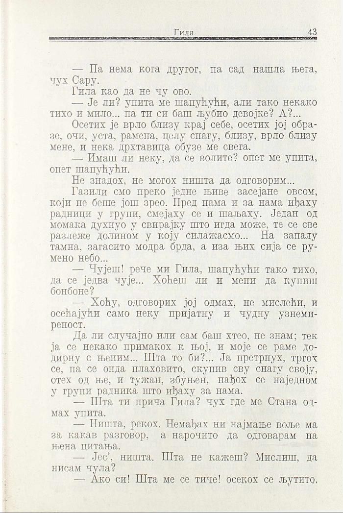 Да ли случајно или сам баш хтео, не знам; тек ја се некако примакох к њој, и моје се раме додирну с њеним... Шта то би?... Ја претрнух, тргох се, па се онда плаховито, скупив сву снагу своју, отех од ње, и тужан, збуњен, нађох се наједном у групи радника што иђаху за нама.