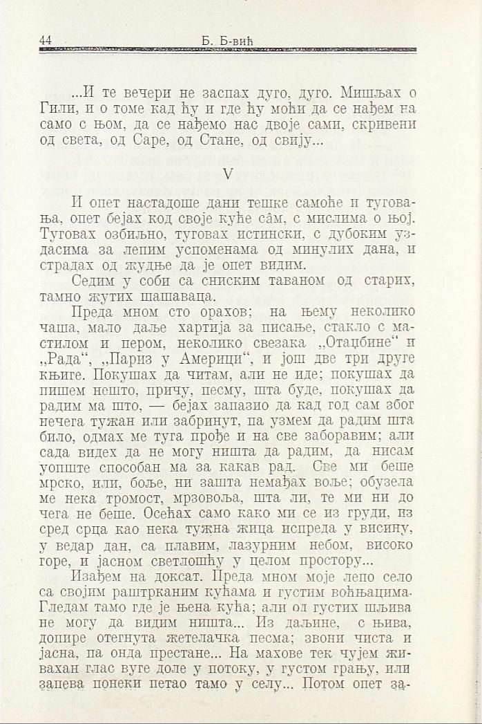 Преда мном сто орахов; на њему неколико чаша, мало даље хартија за писање, стакло с мастилом и пером, неколико свезака „Отаџбине“ и „Рада“, „Париз у Америци“, и још две три друге књиге. Покушах да читам, али не иде; покушах да пишем нешто, причу, песму, шта буде, покушах да радим ма што, — бејах запазио да кад год сам због нечега тужан или забринут, на узмем да радим шта било, одмах ме туга прође и на све заборавим; али сада видех да не могу ништа да радим, да нисам уопште способан ма за какав рад. Све ми беше мрско, или, боље, ни зашта немађах воље; обузела ме нека тромост, мрзовоља, шта ли, те ми ни до чега не беше. Осећах само како ми се из груди, из сред срца као нека тужна жица испреда у висину, у ведар дан, са плавим, лазурним небом, високо горе, и јасном светлошћу у целом простору...