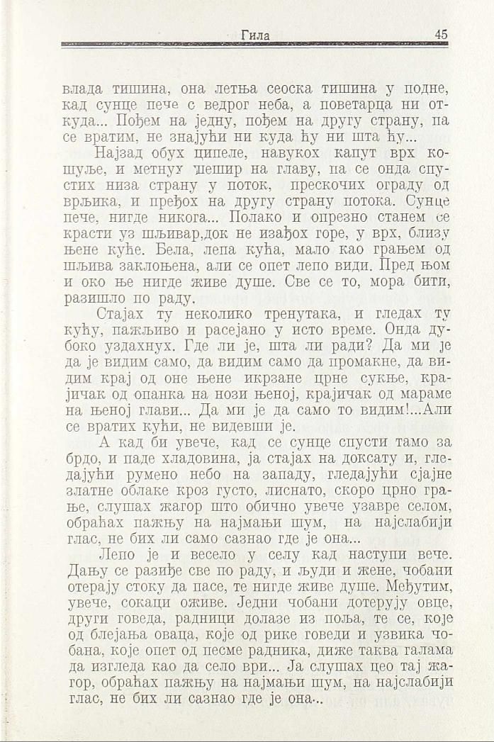 Стајах ту неколико тренутака, и гледах ту кућу, пажљиво и расејано у исто време. Онда дубоко уздахнух. Где ли је, шта ли ради? Да ми Је да је видим само, да видим само да промакне, да видим крај од оне њене икрзане црне сукње, крајичак од опанка на нози њеној, крајичак од мараме на њеној глави... Да ми је да само то видим!...Али се вратих кући, не видевши је.