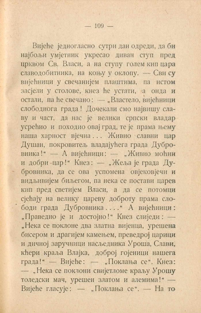 Вијеће једногласно сутри дан одреди, да би најбољи умјетник укресао диван ступ пред црквом Св. Власи, а на ступу голем кип цара славодобитника, на коњу у оклопу. — Сви су вијећници у свечанијем плаштима, па истом засјели у столове, кнез ће устати, а онда и остали, па ће свечано: —„Властело, вијећници слободнога града! Дочекали смо највишу славу и част, да нас је велики српски владар усрећио и походио овај град, те је прама њему наша харност вјечна... Живио славни цар Душан, покровитељ владајућега града Дубровника!“ — А вијећници: — „Живио моћни и добри цар!“ Кнез: — „Жеља је града Дубровника, да се ова успомена овјековјечи и видљивијем биљегом, па нека се постави царев кип пред светијем Власи, а да се потомци сјећају на велику цареву доброту прама слободи града Дубровника....“ А вијећници: „Праведно је и достојно!“ Кнез слиједи: — „Нека се поклоне два златна вијенца, урешена бисером и драгијем камењем, преведрој царици и дичној заручници насљедника Уроша, Слави, кћери краља Влајка, доброј гојеници нашега града!“ — Вијеће: — „Поклања се“. Кнез: — „Нека се поклони свијетломе краљу Урошу толедски мач, урешен златом и алемима!“ — Вијеће гласује: — „Поклања се“. — На то