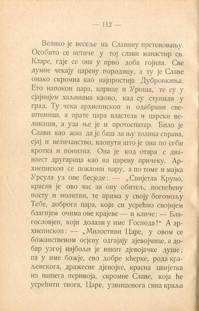 Велико је весеље на Славину прстеновању. Особито се истиче у тој слави манастир св. Кларе, гдје се она у прво доба гојила. Све думне чекају цареву породицу, а ту је Славе онако скромна као најпростија Дубровкиња. Ето напокон цара, царице и Уроша, те су у сјајнијем хаљинама каоно, кад су ступили у град. Ту чека архиепископ и одабрани свештеници, а прате цара властела и царски великаши, а уза ње је и протоспатар. Било је Слави као жао да је баш за њу толика справа, сјај и величанство, каонути што је она по себи кротка и понизна. Она је код отара с дванаест другарица као на цареву причеку. Архиепископ се поклони цару, а по томе и мајка Урсула уз ове бесједе: — „Свијетла Круно, красан је ово час за ову обитељ, посвећену посту и молитви, те прима у своју богомољу Тебе, доброга цара, који си усрећио својијем благијем очима ове крајеве — и кличе: — Благословјен, који долази у име Господа!“ А архиепископ: — „Милостиви Царе, у овом се божанственом осјену одгајају дјевојчице, а добар узгој најбољи је накит дјевојачке душе; па у име божје, ево добре кћерке, рода краљевскога, дражесне дјевојке, красна цвијетка из нашега перивоја, скромне Славе, која ће усрећити твога, Царе, узвишенога сина краља