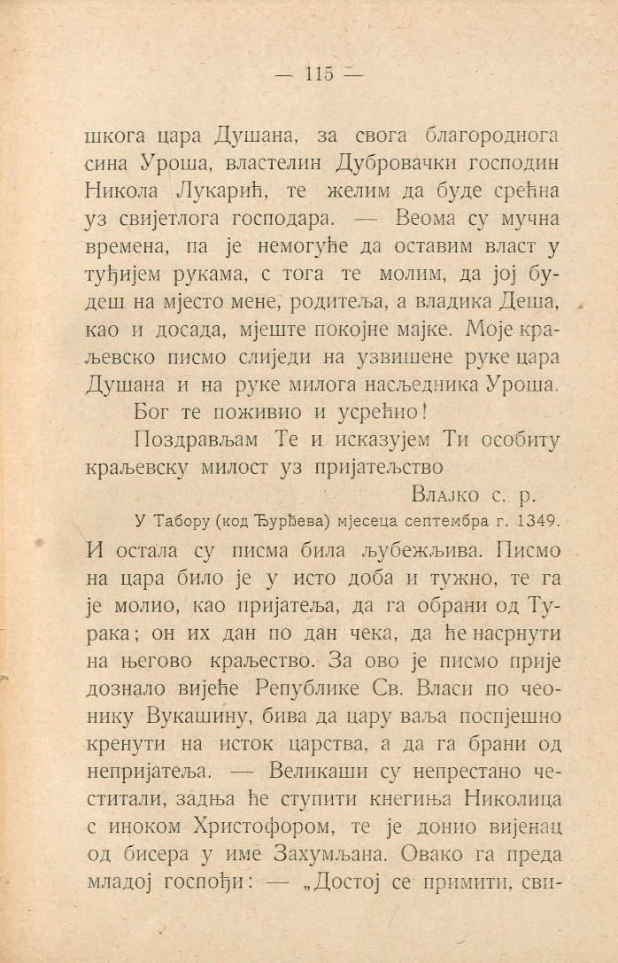 цара Душана, за свога благороднога сина Уроша, властелин Дубровачки господин Никола Лукарић, те желим да буде срећна уз свијетлога господара. — Веома су мучна времена, па је немогуће да оставим власт у туђијем рукама, с тога те молим, да јој будеш на мјесто мене, родитеља, а владика Деша, као и досада, мјеште покојне мајке. Моје краљевско писмо слиједи на узвишене руке цара Душана и на руке милога насљедника Уроша.