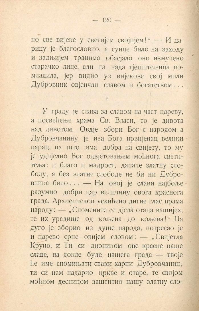 У граду је слава за славом на част цареву, а посвећење храма Св. Власи, то је дивота над дивотом. Овдје збори Бог с народом а Дубровчанину је иза Бога првијенац велики парац, па што има добра на свијету, то му је удијелио Бог одвјетовањем моћнога светитеља: и благо и мадрост, дапаче златну слободу, а без златне слободе не би ни Дубровника било... — На овој је слави најбоље разумио добри цар величину овога краснога града. Архиепископ усхићено дигне глас прама народу: — „Спомените се дјела отаца вашијех, те их урадише од кољена до кољена!“ На дуго је зборио из душе народа, потресао је и царево срце овијем словом: — „Свијетла Круно, и Ти си диоником ове красне наше славе, па докле буде нашега града — твоје ће име спомињати сваки харни Дубровчанин; ти си нам надарио цркве и отаре, те својом моћном десницом заштитио нашу златну слободу,