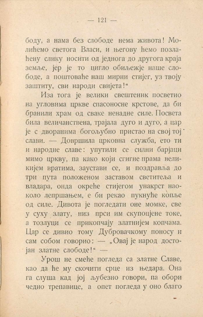 Иза тога је велики свештеник посветио на угловима цркве спасоносне крстове, да би бранили храм од сваке ненадне силе. Посвета била величанствена, трајала дуго и дуго, а цар је с дворанима богољубно пристао на свој тој слави. — Довршила црковна служба, ето ти и народне славе: упутили се силни барјаци мимо цркву, па како који стигне прама великијем вратима, заустави се, и поздравља до три пута положеном заставом светитеља и владара, онда окреће стијегом унакрст наоколо лепршањем, е би рекао пукнуће копље од силе. Дивота је погледати оне момке, све у суху злату, низ прси им скупоцјене токе, а тозлуци се прикопчају златнијем копчама. Цар се дивио тому Дубровачкому поносу и сам собом говорио: — „Овај је народ достојан златне слободе!“ —