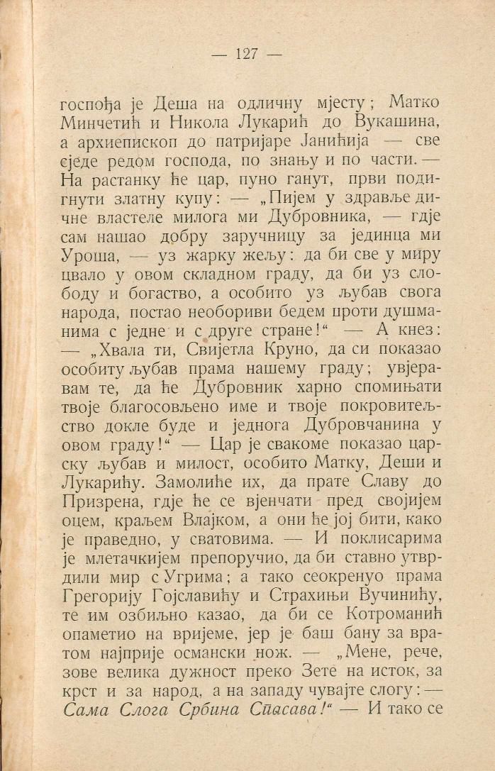 госпођа је Деша на одличну мјесту; Матко Минчетић и Никола Лукарић до Вукашина, а архиепископ до патријаре Јанићија — све сједе редом господа, по знању и по части. — На растанку ће цар, пуно ганут, први подигнути златну купу: — „Пијем у здравље дичне властеле милога ми Дубровника, — гдје сам нашао добру заручницу за јединца ми Уроша, — уз жарку жељу: да би све у миру цвало у овом складном граду, да би уз слободу и богаство, а особито уз љубав свога народа, постао необориви бедем проти душманима с једне и с друге стране!“ — А кнез: — „Хвала ти, Свијетла Круно, да си показао особиту љубав прама нашему граду; увјеравам те, да ће Дубровник харно спомињати твоје благосовљено име и твоје покровитељство докле буде и једнога Дубровчанина у овом граду!“ — Цар је свакоме показао царску љубав и милост, особито Матку, Деши и Лукарићу. Замолиће их, да прате Славу до Призрена, гдје ће се вјенчати пред својијем оцем, краљем Влајком, а они ће јој бити, како је праведно, у сватовима. — И поклисарима је млетачкијем препоручио, да би ставно утврдили мир с Угрима; а тако се окренуо прама Грегорију Гојславићу и Страхињи Вучинићу, те им озбиљно казао, да би се Котроманић опаметио на вријеме, јер је баш бану за вратом најприје османски нож. — „Мене, рече, зове велика дужност преко Зете на исток, за крст и за народ, а на западу чувајте слогу: — Сама Слога Србина Спасава!“ — И тако се