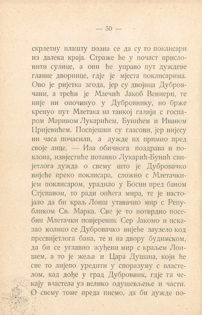 скрлетну плашту позна се да су то поклисари из далека краја. Страже ће у почаст прислонити сулице, а они ће управо пут дуждеве главне дворнице, гдје је мјеста поклисарима. Ово је ријетка згода, јер су двојица Дубровчани, а трећи је Млечић Јакоб Вениери, те није ни опочинуо у Дубровнику, но брже кренуо пут Млетака на танкој галији с госпаром Марином Лукарићем, Бунићем и Иваном Цријевићем. Поспјешни су гласови, јер нијесу ни часа почасили, а дужде их примио пред своје лице. — Иза обичнога поздрава и поклона, извјестиће потанко Лукарић-Бунић свијетлога дужда о свему што је Дубровачко вијеће преко поклисара, сложно с Млетачкијем поклисаром, урадило у Босни пред баном Стјепаном, то ради опћега мира, те је настојало да би краљ Лоиш утаначио мир с Републиком Св. Марка. Све је то потврдио посебни Млетачки повјереник Сер Јакомо и исказао колико се Дубровачко вијеће заузело код пресвијетлога бана, те и на двору будимском, да би се углавио жуђени мир с краљем Лоишем, а то је жеља и Цара Душана, који ће све то лијепо уредити у споразуму с властелом, кад дође у град Дубровник, гдје га чекају властела уз велико одушевљење и части. О свему томе преда писмо, да би дужде потанко