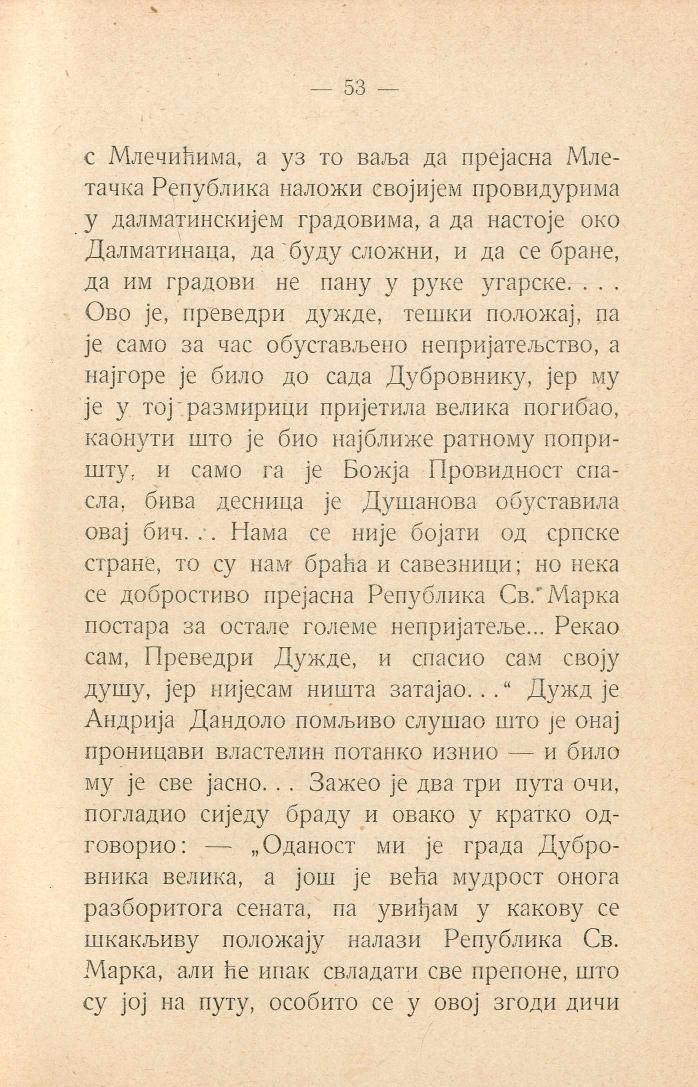 с Млечићима, а уз то ваља да прејасна Млетачка Република наложи својијем провидурима у далматинскијем градовима, а да настоје око Далматинаца, да буду сложни, и да се бране, да им градови не пану у руке угарске.... Ово је, преведри дужде, тешки положај, па је само за час обустављено непријатељство, а најгоре је било до сада Дубровнику, јер му је у тој размирици пријетила велика погибао, каонути што је био најближе ратному попришту, и само га је Божја Провидност спасла, бива десница је Душанова обуставила овај бич... Нама се није бојати од српске стране, то су нам браћа и савезници; но нека се добростиво прејасна Република Св. Марка постара за остале големе непријатеље... Рекао сам, Преведри Дужде, и спасио сам своју душу, јер нијесам ништа затајао...“ Дужд је Андрија Дандоло помљиво слушао што је онај проницави властелин потанко изнио — и било му је све јасно... Зажео је два три пута очи, погладио сиједу браду и овако у кратко одговорио: — „Оданост ми је града Дубровника велика, а још је већа мудрост онога разборитога сената, па увиђам у какову се шкакљиву положају налази Република Св. Марка, али ће ипак свладати све препоне, што су јој на путу, особито се у овој згоди дичи