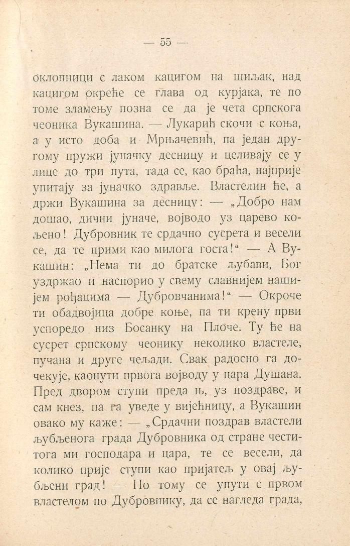оклопници с лаком кацигом на шиљак, над кацигом окреће се глава од курјака, те по томе зламењу позна се да је чета српскога чеоника Вукашина. — Лукарић скочи с коња, а у исто доба и Мрњачевић, па један другому пружи јуначку десницу и целивају се у лице до три пута, тада се, као браћа, најприје упитају за јуначко здравље. Властелин ће, а држи Вукашина за десницу: — „Добро нам дошао, дични јуначе, војводо уз царево кољено! Дубровник те срдачно сусрета и весели се, да те прими као милога госта!“ — А Вукашин: „Нема ти до братске љубави, Бог уздржао и наспорио у свему славнијем нашијем рођацима — Дубровчанима! “ — Окроче ти обадвојица добре коње, па ти крену први успоредо низ Босанку на Плоче. Ту ће на сусрет српскому чеонику неколико властеле, пучана и друге чељади. Свак радосно га дочекује, каонути првога војводу у цара Душана. Пред двором ступи преда њ, уз поздраве, и сам кнез, па га уведе у вијећницу, а Вукашин овако му каже: — „Срдачни поздрав властели љубљенога града Дубровника од стране честитога ми господара и цара, те се весели, да колико прије ступи као пријатељ у овај љубљени град! — По тому се упути с првом властелом по Дубровнику, да се нагледа града,