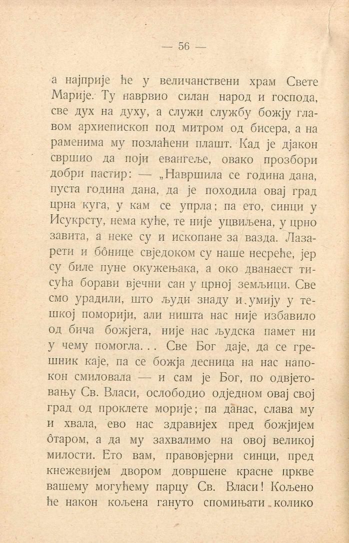 а најприје ће у величанствени храм Свете Марије.- Ту наврвио силан народ и господа, све дух на духу, а служи службу божју главом архиепископ под митром од бисера, а на раменима му позлаћени плашт. Кад је дјакон свршио да поји евангеље, овако прозбори добри пастир: — „Навршила се година дана, пуста година дана, да је походила овај град црна куга, у кам се упрла; па ето, синци у Исукрсту, нема куће, те није уцвиљена, у црно завита, а неке су и ископане за вазда. Лазарети и бонице свједоком су наше несреће, јер су биле пуне окужењака, а око дванаест тисућа борави вјечни сан у црној земљици. Све смо урадили, што људи знаду и умију у тешкој поморији, али ништа нас није избавило од бича божјега, није нас људска памет ни у чему помогла... Све Бог даје, да се грешник каје, па се божја десница на нас напокон смиловала — и сам је Бог, по одвјетовању Св. Власи, ослободио одједном овај свој град од проклете морије; па данас, слава му и хвала, ево нас здравијех пред божјијем отаром, а да му захвалимо на овој великој милости. Ето вам, правовјерни синци, пред кнежевијем двором довршене красне цркве вашему могућему парцу Св. Власи! Кољено ће након кољена гануто спомињати колико