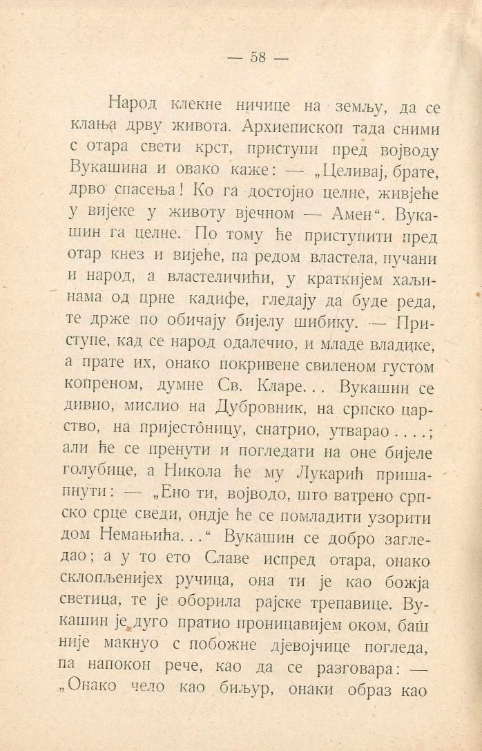 Народ клекне ничице на земљу, да се клања дрву живота. Архиепископ тада сними с отара свети крст, приступи пред војводу Вукашина и овако каже: — „Целивај, брате, дрво спасења! Ко га достојно целне, живјеће у вијеке у животу вјечном — Амен“. Вукашин га целне. По тому ће приступити пред отар кнез и вијеће, па редом властела, пучани и народ, а властеличићи, у краткијем хаљинама од црне кадифе, гледају да буде реда, те држе по обичају бијелу шибику. — Приступе, кад се народ одалечио, и младе владике, а прате их, онако покривене свиленом густом копреном, думне Св. Кларе... Вукашин се дивио, мислио на Дубровник, на српско царство, на пријестоницу, снатрио, утварао....; али ће се пренути и погледати на оне бијеле голубице, а Никола ће му Лукарић пришапнути: „Ено ти, војводо, што ватрено српско срце сведи, ондје ће се помладити узорити дом Немањића...“ Вукашин се добро загледао; а у то ето Славе испред отара, онако склопљенијех ручица, она ти је као божја светица, те је оборила рајске трепавице. Вукашин је дуго пратио проницавијем оком, баш није макнуо с побожне дјевојчице погледа, па напокон рече, као да се разговара: — „Онако чело као биљур, онаки образ као