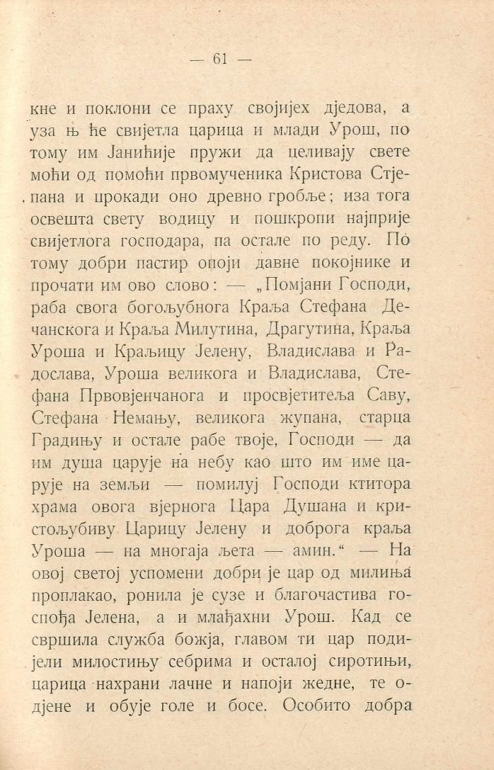 и поклони се праху својијех дједова, а уза њ ће свијетла царица и млади Урош, по тому им Јанићије пружи да целивају свете моћи од помоћи првомученика Кристова Стјепана и прокади оно древно гробље; иза тога освешта свету водицу и пошкропи најприје свијетлога господара, па остале по реду. По тому добри пастир опоји давне покојнике и прочати им ово слово: — „Помјани Господи, раба свога богољубнога Краља Стефана Дечанскога и Краља Милутина, Драгутина, Краља Уроша и Краљицу Јелену, Владислава и Радослава, Уроша великога и Владислава, Стефана Првовјенчанога и просвјетитеља Саву, Стефана Немању, великога жупана, старца Градињу и остале рабе твоје, Господи — да им душа царује на небу као што им име царује на земљи — помилуј Господи ктитора храма овога вјернога Цара Душана и кристољубиву Царицу Јелену и доброга краља Уроша — на многаја љета — амин.“ — На овој светој успомени добри је цар од милиња проплакао, ронила је сузе и благочастива госпођа Јелена, а и млађахни Урош. Кад се свршила служба божја, главом ти цар подијели милостињу себрима и осталој сиротињи, царица нахрани лачне и напоји жедне, те одјене и обује голе и босе. Особито добра