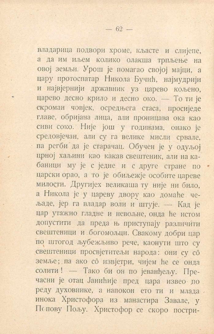 владарица подвори хроме, кљасте и слијепе, а да им иљем колико олакша трпљење на овој земљи. Урош је помагао својој мајци, а цару протоспатар Никола Бучић, најмудрији и највјернији државник уз царево кољено, царево десно крило и десно око. — То ти је скроман човјек, осредњега стаса, просиједе главе, обријана лица, али проницава ока као сиви соко. Није још у годинама, онако је средовјечан, али су га велике мисли срвале, па регби да је старачац. Обучен је у одуљој црној хаљини као какав свештеник, али на кабаници му је с једне и с друге стране по царски орао, а то је обиљежје особите цареве милости. Другијех великаша ту није ни било, а Никола је у цареву двору као домаће чељаде, јер га владар воли и штује. — Кад је цар утажио гладне и невољне, онда ће истом допустити да преда њ приступају различити свештеници и богомољци. Свакому добри цар по штогод љубежљиво рече, каонути што су свештеници просвјетитељи народа: они су со земље; па ако со извјетри, чијем ће се онда солити! — Тако би он по јеванђељу. Пречасни је отац Јанићије пред цара извео по реду духовнике, а напокон ето ти и млада инока Христофора из манастира Завале, у Попову Пољу. Христофор се скоро постригао,