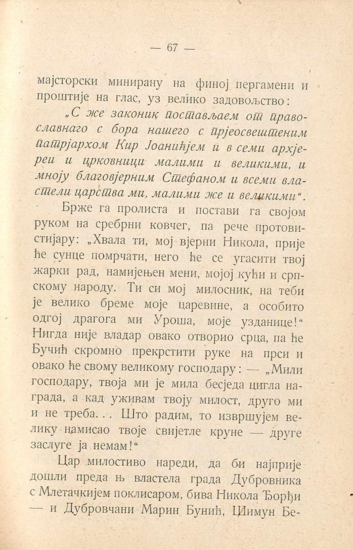 Брже га пролиста и постави га својом руком на сребрни ковчег, па рече протовистијару: „Хвала ти, мој вјерни Никола, прије ће сунце помрчати, него ће се угасити твој жарки рад, намијењен мени, мојој кући и српскому народу. Ти си мој милосник, на теби је велико бреме моје царевине, а особито одгој драгога ми Уроша, моје узданице!“ Нигда није владар овако отворио срца, па ће Бучић скромно прекрстити руке на прси и овако ће свому великому господару: — „Мили господару, твоја ми је мила бесједа цигла награда, а кад уживам твоју милост, друго ми и не треба... Што радим, то извршујем велику намисао твоје свијетле круне — друге заслуге ја немам!“