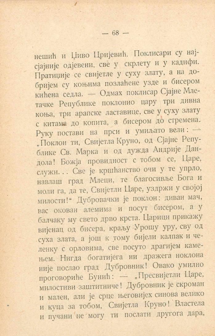 и Џиво Цријевић. Поклисари су најсјајније одјевени, све у скрлету и у кадифи. Пратиџије се свијетле у суху злату, а на добријем су коњима позлаћене узде и бисером кићена седла. — Одмах поклисар Сјајне Млетачке Републике поклонио цару три дивна коња, три арапске ластавице, све у суху злату с китама до копита, а бисером до стремена. Руку постави на прси и умиљато вели: „Поклон ти, Свијетла Круно, од Сјајне Републике Св. Марка и од дужда Андрије Дандола! Божја провидност с тобом се, Царе, служи... Све је кршћанство очи у те упрло, навлаш град Млеци, те благосивље Бога и моли га, да те, Свијетли Царе, уздржи у својој милости!“ Дубровачки је поклон: диван мач, вас окован алемима и посут бисером, а у балчаку му свето дрво крста. Царици прикажу вијенац од бисера, краљу Урошу уру, сву од суха злата, а још к тому бијели калпак и челенку с орловима, све посуто драгијем камењем. Нигда богатијега ни дражега поклона није послао град Дубровник! Овако умилно проговориће Бунић: — „Пресвијетли Царе, милостиви заштитниче! Дубровник је скроман и мален, али је срце његовијех синова велико и куца за тобом, Свијетла Круно! Властела и пучани не могу ти послати другога дара,