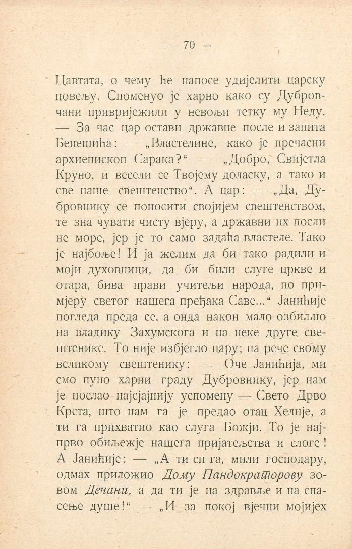 Цавтата, о чему ће напосе удијелити царску повељу. Споменуо је харно како су Дубровчани привријежили у невољи тетку му Неду. — За час цар остави државне после и запита Бенешића: — „Властелине, како је пречасни архиепископ Сарака?“ — „Добро, Свијетла Круно, и весели се Твојему доласку, а тако и све наше свештенство“. А цар: — „Да, Дубровнику се поносити својијем свештенством, те зна чувати чисту вјеру, а државни их посли не море, јер је то само задаћа властеле. Тако је најбоље! И ја желим да би тако радили и моји духовници, да би били слуге цркве и отара, бива прави учитељи народа, по примјеру светог нашега пређака Саве...“ Јанићије погледа преда се, а онда након мало озбиљно на владику Захумскога и на неке друге свештенике. То није избјегло цару; па рече свому великому свештенику: — Оче Јанићија, ми смо пуно харни граду Дубровнику, јер нам је послао најсјајнију успомену — Свето Дрво Крста, што нам га је предао отац Хелије, а ти га прихватио као слуга Божји. То је најпрво обиљежје нашега пријатељства и слоге! А Јанићије: — „А ти си га, мили господару, одмах приложио Дому Пандократорову зовом Дечани, а да ти је на здравље и на спасење душе!“ — „И за покој вјечни мојијех