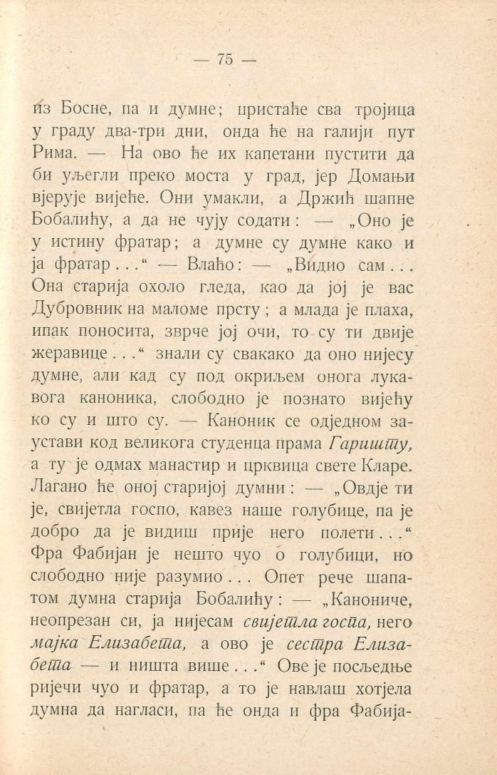 из Босне, па и думне; пристаће сва тројица у граду два-три дни, онда ће на галији пут Рима. — На ово ће их капетани пустити да би уљегли преко моста у град, јер Домањи вјерује вијеће. Они умакли, а Држић шапне Бобалићу, а да не чују содати: — „Оно је у истину фратар; а думне су думне како и ја фратар...“ — Влаћо: — „Видио сам... Она старија охоло гледа, као да јој је вас Дубровник на маломе прсту; а млада је плаха, ипак поносита, зврче јој очи, то су ти двије жеравице... “ знали су свакако да оно нијесу думне, али кад су под окриљем онога лукавога каноника, слободно је познато вијећу ко су и што су. — Каноник се одједном заустави код великога студенца прама Гаришту, а ту је одмах манастир и црквица свете Кларе. Лагано ће оној старијој думни: — „Овдје ти је, свијетла госпо, кавез наше голубице, па је добро да је видиш прије него полети...“ Фра Фабијан је нешто чуо о голубици, но слободно није разумио... Опет рече шапатом думна старија Бобалићу: — „Канониче, неопрезан си, ја нијесам свијетла госпа, него мајка Елизабета, а ово је сестра Елизабета — и ништа више... “ Ове је посљедње ријечи чуо и фратар, а то је навлаш хотјела думна да нагласи, па ће онда и фра Фабијану: