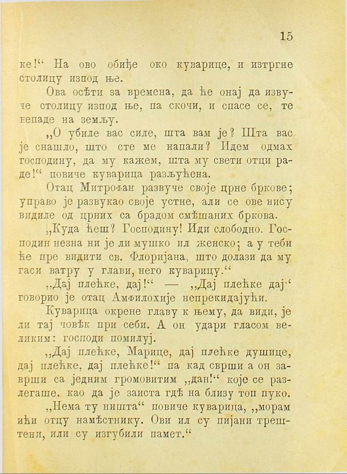 „О убиле вас силе, шта вам је?“ Шта вас је снашло, што сте ме напали? Идем одмах господину, да му кажем, шта му свети отци раде!“ повиче куварица разљућена.