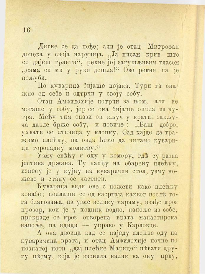 А она двоица кад се наједу плећке оду на куваричина врата, и отац Амфилохије почне по познатој ноти „дај плећке Марице“ пѣвати другу пѣсму, која је звонила налик на ону прву,