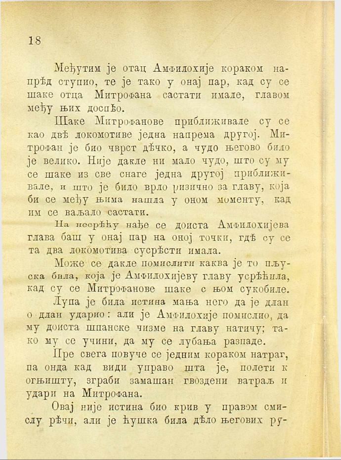 Шаке Митрофанове приближивале су се као двѣ локомотиве једна напрема другој. Митрофан је био чврст дѣчко, а чудо његово било је велико. Није дакле ни мало чудо, што су му се шаке из све снаге једна другој приближивале, ни што је било врло ризично за главу, која би се међу њима нашла у оном моменту, кад им се ваљало састати.