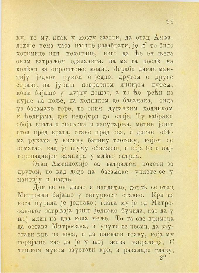 те му ипак у мозгу зазори, да отац Амфилохије нема часа најпре разабрати, је л’ то било хотимице или нехотице, него да ће он њега оним ватраљем одалачити, па ма га послѣ на колѣни за опроштење молио. Зграби дакле мантију једном руком с једне, другом с друге стране, па јуриш повратном линијом путем, коим бијаше у кујну дошао, а то ће рећи из кујне на поље, па ходником до басамака, онда уз басамаке горе, те оним дугачким ходником к ћелијама, док недојури до своје. Ту забрави обоја врата и спољска и изнутарња, метне јошт стол пред врата, стане пред ова, и дигне обѣма рукама у висину батину глогову, којом се помагао, кад је шуму обилазио, и која би и најгоропаднијег вампира у млѣво сатрла.