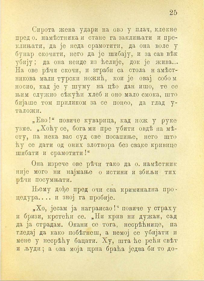 „Ево!“ повиче куварица, кад нож у руке узме. „Хоћу се, бога ми пре убити овдѣ на мѣсту, па нека вас суд све посапиње, него што ћу се дати од оних злотвора без сваке кривице шибати и срамотити!“