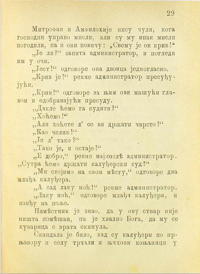 „Сутра ћемо држати калуђерски суд!“ „Ми стојимо на свом мѣсту,“ одговоре два млађа калуђера.