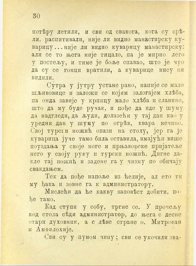 потѣру летили, и сви од свакога, кога су срѣли, распитивали, није ли видио манастирску куварицу...није ли видио куварицу манастирску: али се то њега није тицало, па је мирно лего у постељу, и тиме је боље спавао, што је чуо да су се гонци вратили, а куварице нису ни видили.
