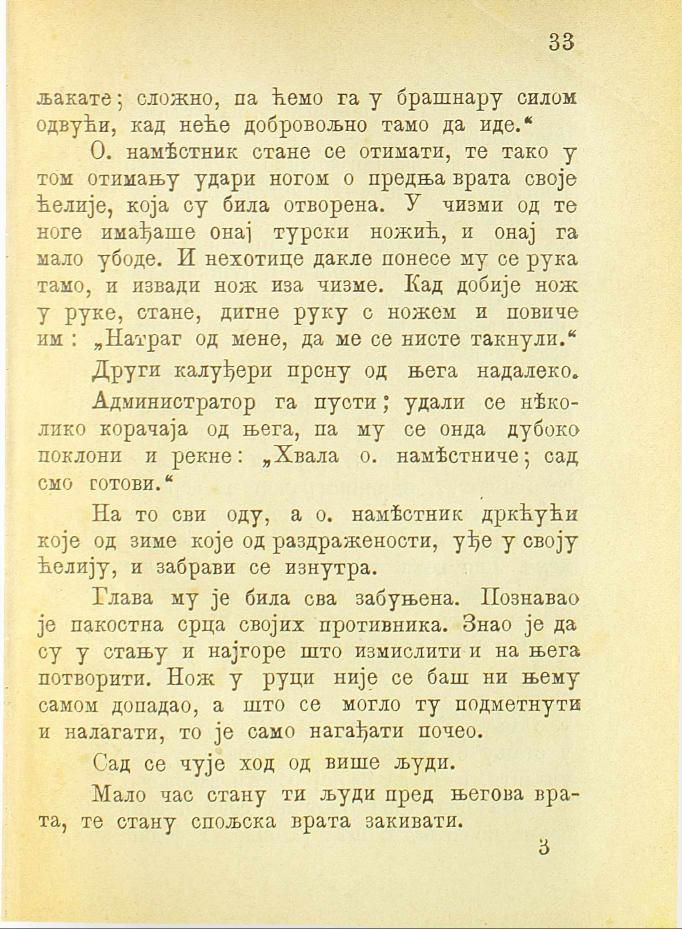 О. намѣстник стане се отимати, те тако у том отимању удари ногом о предња врата своје ћелије, која су била отворена. У чизми од те ноге имађаше онај турски ножић, и онај га мало убоде. И нехотице дакле понесе му се рука тамо, и извади нож иза чизме. Кад добије нож у руке, стане, дигне руку с ножем и повиче им: „Натраг од мене, да ме се нисте такнули.“