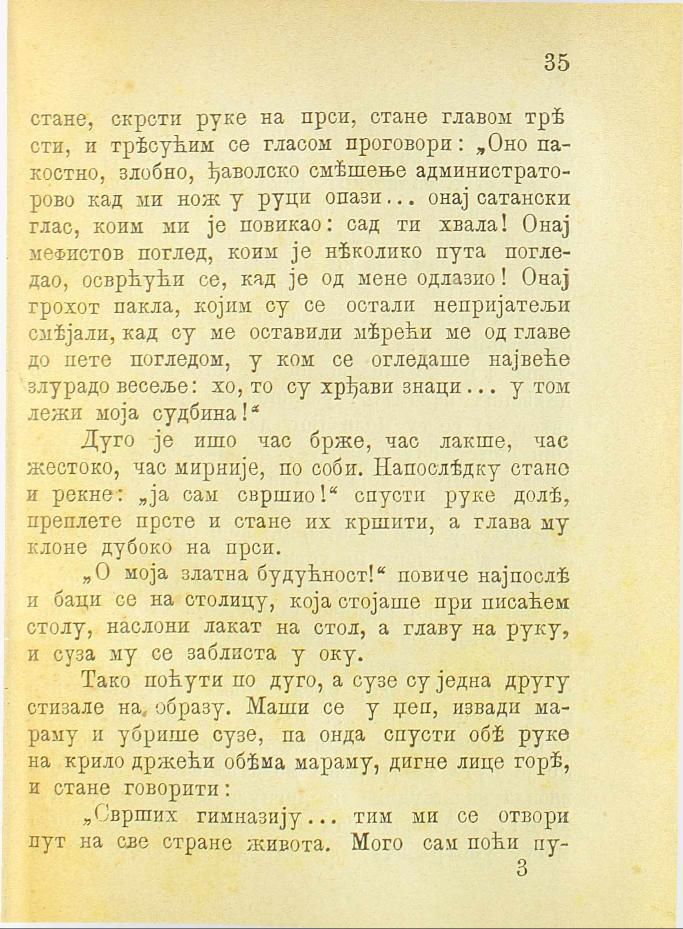 скрсти руке на прси, стане главом трѣсти, и трѣсућим се гласом проговори: „Оно пакостно, злобно, ђаволско смѣшење администраторово кад ми нож у руци опази... онај сатански глас, коим ми је повикао: сад ти хвала! Онај мефистов поглед, коим је нѣколико пута погледао, осврћући се, кад је од мене одлазио! Онај грохот пакла, којим су се остали непријатељи смѣјали, кад су ме оставили мѣрећи ме од главе до пете погледом, у ком се огледаше највеће злурадо весеље: хо, то су хрђави знаци... у том лежи моја судбина!“