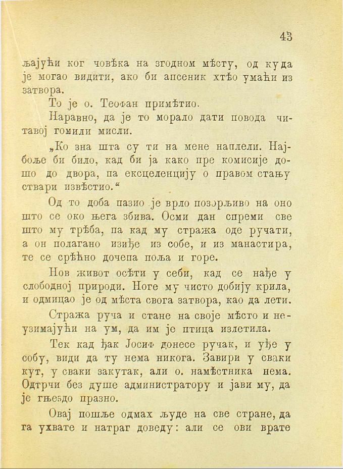 Тек кад ђак Јосиф донесе ручак, и уђе у собу, види да ту нема никога. Завири у сваки кут, у сваки закутак, али о. намѣстника нема. Одтрчи без душе администратору и јави му, да је гњездо празно.