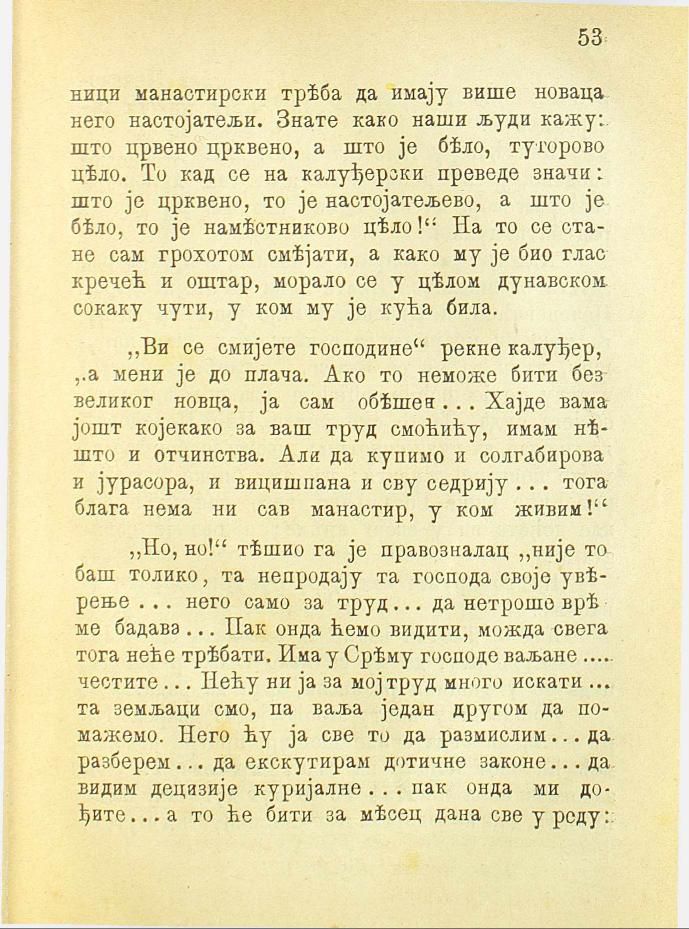 „Ви се смијете господине“ рекне калуђер,„а мени је до плача. Ако то неможе бити без великог новца, ја сам обѣшен... Хајде вама јошт којекако за ваш труд смоћићу, имам нѣшто и отчинства. Али да купимо и солгабирова и јурасора, и вицишпана и сву седрију... тога блага нема ни сав манастир, у ком живим!“