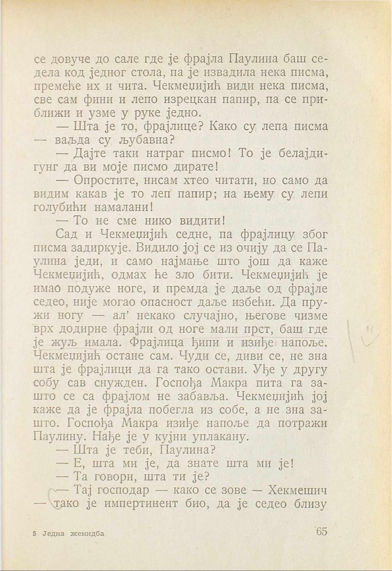 се довуче до сале где је фрајла Паулина баш седела код једног стола, па је извадила нека писма, премеће их и чита. Чекмеџијић види нека писма, све сам фини и лепо изрецкан папир, па се приближи и узме у руке једно.