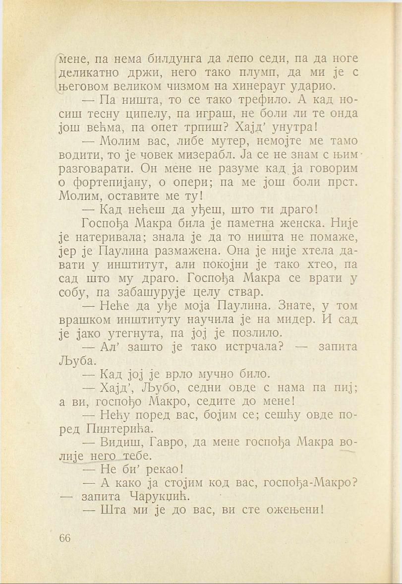 Госпођа Макра била је паметна женска. Није је натеривала; знала је да то ништа не помаже, јер је Паулина размажена. Она је није хтела давати у инштитут, али покојни је тако хтео, па сад што му драго. Госпођа Макра се врати у собу, па забашурује целу ствар.