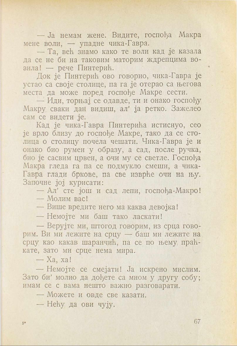 Кад је чика-Гавра Пинтерића истиснуо, сео је врло близу до госпође Макре, тако да се столица о столицу почела чешати. Чика-Гавра је и онако био румен у образу, а сад, после ручка, био је сасвим црвен, а очи му се светле. Госпођа Макра гледа га па се подмукло смеши, а чика-Гавра глади бркове, па све изврће очи на њу. Започне јој курисати: