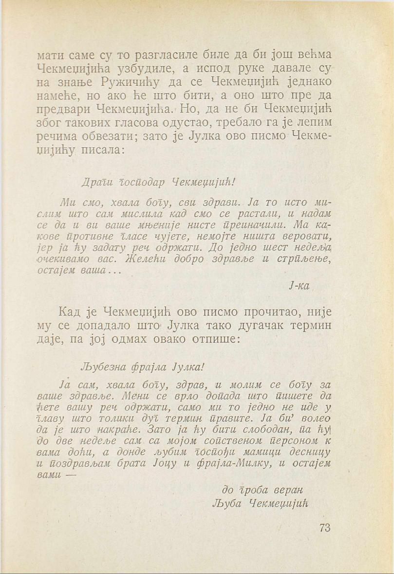 мати саме су то разгласиле биле да би још већма Чекмеџијића узбудиле, а испод руке давале су на знање Ружичићу да се Чекмеџијић једнако намеће, но ако ће што бити, а оно што пре да предвари Чекмеџијића. Но, да не би Чекмеџијић због такових гласова одустао, требало га је лепим речима обвезати; зато је Јулка ово писмо Чекмеџијићу писала: