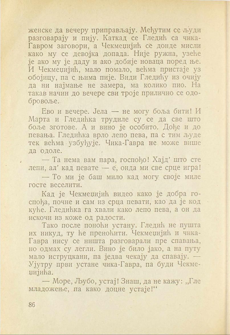 Тако после поноћи устану. Гледић не пушта их никуд, ту ће преноћити. Чекмеџијић и чика-Гавра нису се ништа разговарали пре спавања, но одмах су легли. Вино је било јако, а на путу мало иструцкани, па једва чекају да спавају. — Ујутру први устане чика-Гавра, па буди Чекмеџијића.