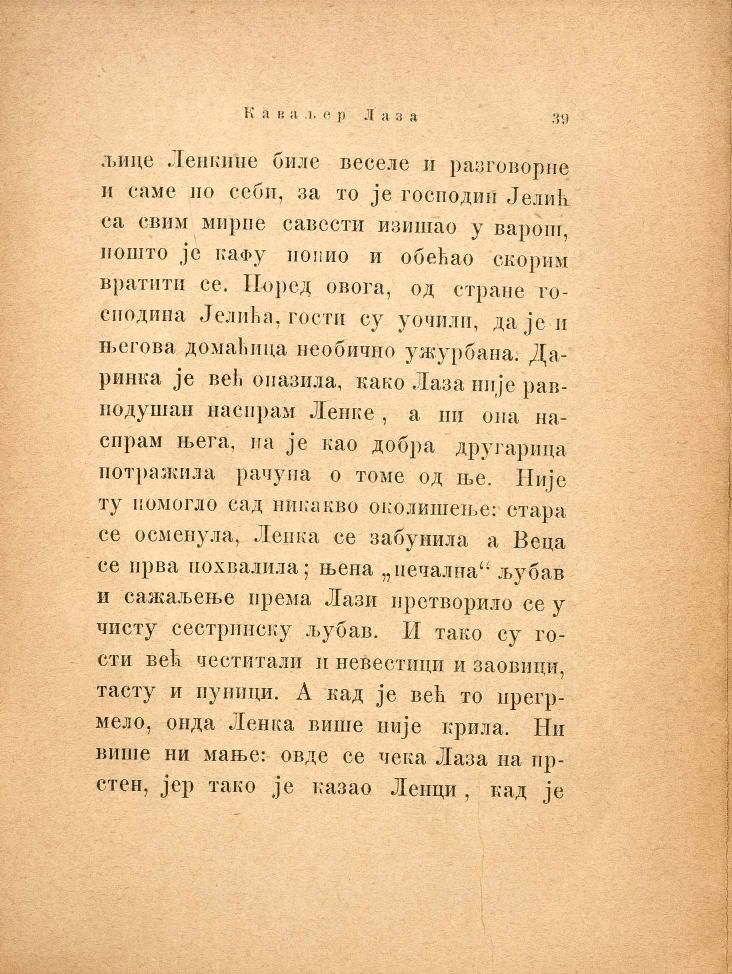 Ленкине биле веселе и разговорне и саме по себи, за то је господин Јелић са свим мирне савести изишао у варош, пошто је кафу попио и обећао скорим вратити се. Поред овога, од стране господина Јелића, гости су уочили, даје и његова домаћица необично ужурбана. Даринка је већ опазила, како Лаза није равнодушан наспрам Ленке, а ни она наспрам њега, па је као добра другарица потражила рачуна о томе од ње. Није ту помогло сад никакво околишење: стара се осменула. Ленка се забунила а Веца се прва похвалила; њена „печална“ љубав и сажаљење према Лази претворило се у чисту сестринску љубав. И тако су гости већ честитали и невестици и заовици, тасту и пуници. А кад је већ то прегрмело, онда Ленка више није крила. Ни више ни мање: овде се чека Лаза на прстен, јер тако је казао Ленци, кад је