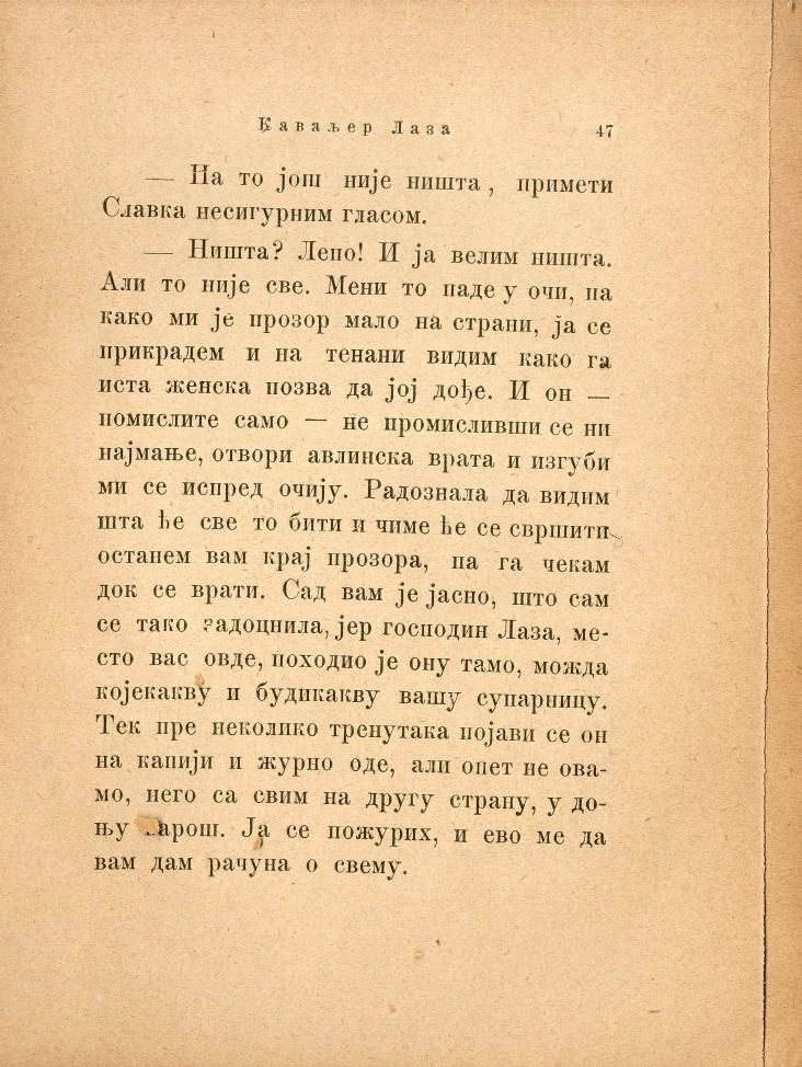 — Ништа? Лепо! И ја велим ништа. Али то није све. Мени то паде у очи, па како ми је прозор мало на страни, ја се прикрадем и на тенани видим како га иста женска позва да јој дође. И он — помислите само — не промисливши се ни најмање, отвори авлинска врата и изгуби ми се испред очију. Радознала да видим шта ће све то бити и чиме ће се свршити останем вам крај прозора, па га чекам док се врати. Сад вам је јасно, што сам се тако задоцнила, јер господин Лаза, место вас овде, походио је ону тамо, можда којекакву и будикакву вашу супарницу. Тек пре неколико тренутака појави се он на капији и журно оде, али опет не овамо, него са свим на другу страну, у доњу варош. Ја се пожурих, и ево ме да вам дам рачуна о свему.