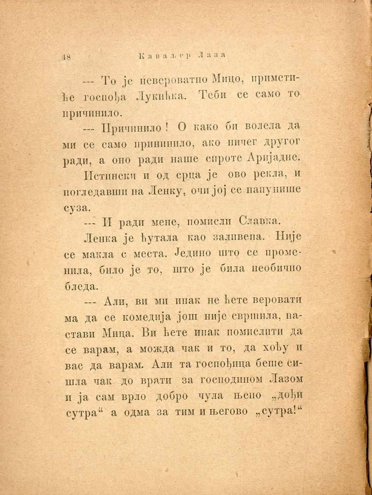 — Али, ви ми ипак не ћете веровати ма да се комедија још није свршила, настави Мица. Ви ћете ипак помислити да се варам, а можда чак и то, да хоћу и вас да варам. Али та госпођица беше сишла чак до врати за господином Лазом и ја сам врло добро чула њено „дођи сутра“ а одма за тим и његово „сутра!“