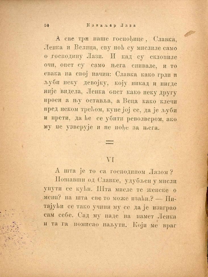 А све три наше госпођице, Славка, Ленка и Велица сву ноћ су мислиле само о господину Лази. И кад су склопиле очи, опет су само њега снивале, и то свака на свој начин: Славка како грли и љуби неку девојку, коју никад и нигде није видела, Ленка опет како неку другу проси а њу оставља, а Веца како клечи пред неком трећом, куне јој се, да је љуби и прети, да ће се убити револвером, ако му не узверује и не пође за њега.