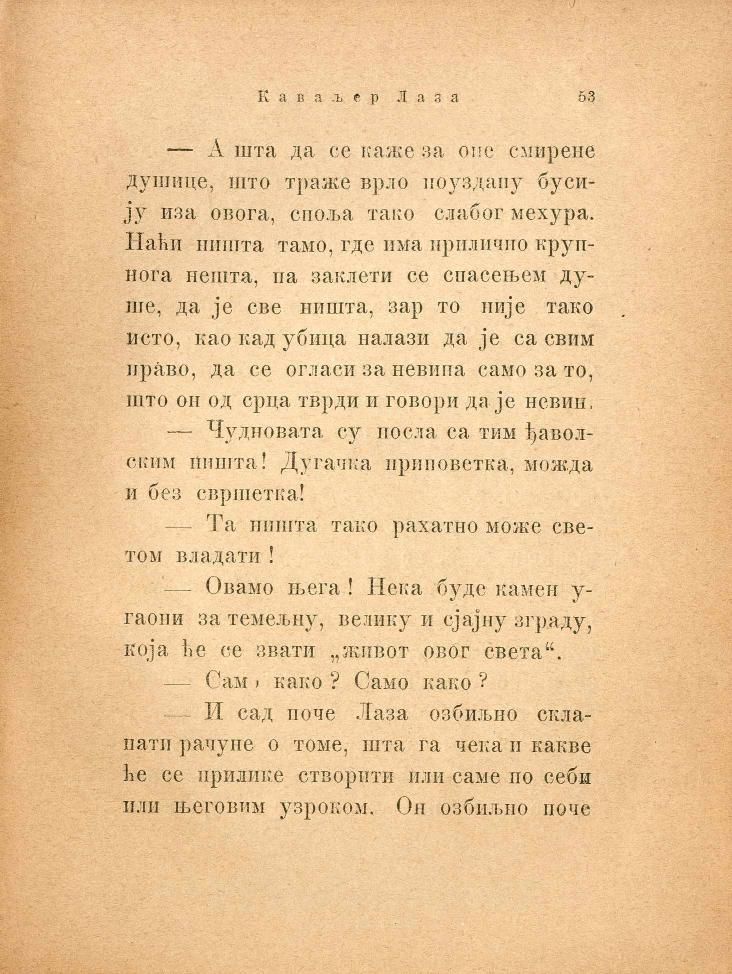 — А шта да се каже за оне смирене душице, што траже врло поуздану бусију иза овога, споља тако слабог мехура. Наћи ништа тамо, где има прилично крупнога нешта, па заклети се спасењем душе, да је све ништа, зар то није тако исто, као кад убица налази да је са свим право, да се огласи за невина само за то, што он од срца тврди и говори да је невин.