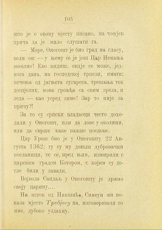 — Море, Оногошт је био град на гласу, вели он: — у њему се је још Цар Немања веселио! Ево видиш, овдје се може, једнога дана, на господској трпези, имати: печења од јагњета сугарета, трешања тек доспјелих, нова грожђа са свим зрела, и леда — као усред зиме! Зар то није за причу?!