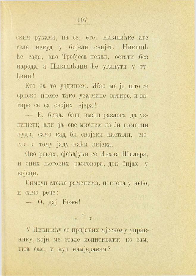 У Никшићу се пријавих мјесному управнику, који ме стаде испитивати: ко сам, шта сам, и куд намјеравам?