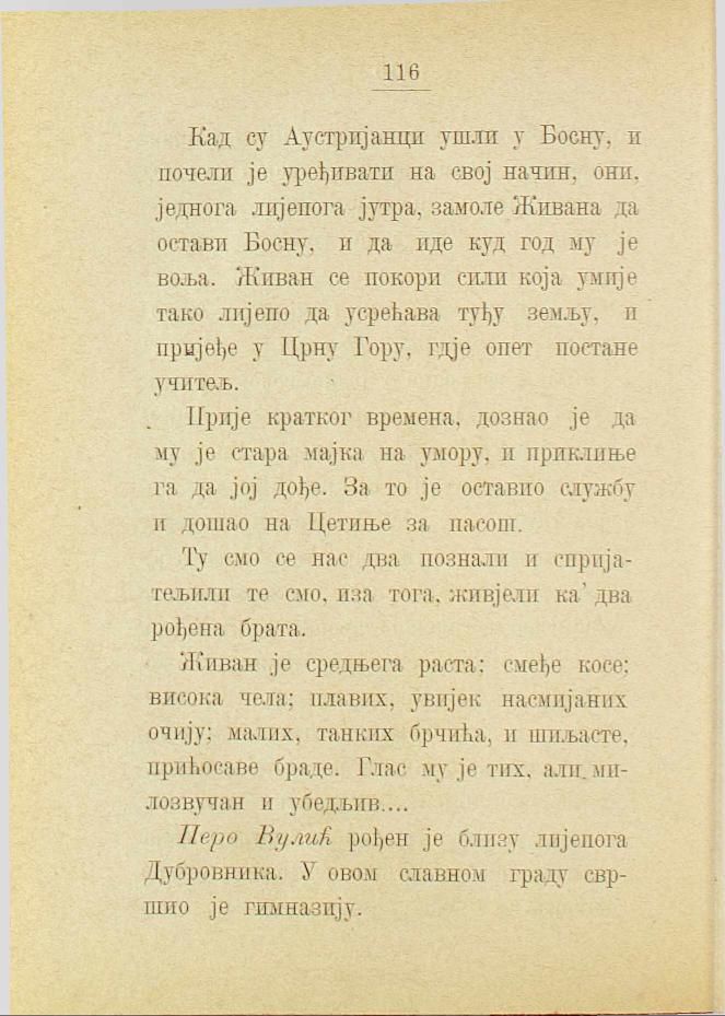 Кад су Аустријанци ушли у Босну, и почели је уређивати на свој начин, они, једнога лијепога јутра, замоле Живана да остави Босну, и да иде куд год му је воља. Живан се покори сили која умије тако лијепо да усрећава туђу земљу, и пријеђе у Црну Гору, гдје опет постане учитељ.