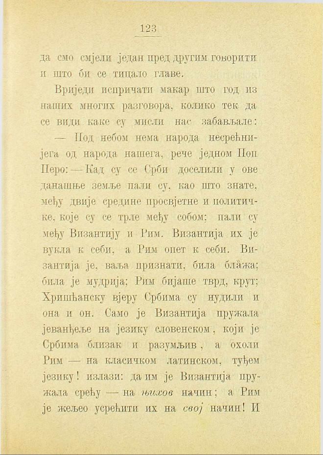 — Под небом нема народа несрећнијега од народа нашега, рече једном Поп Перо: — Кад су се Срби доселили у ове данашње земље пали су, као што знате, међу двије средине просвјетне и политичке, које су се трле међу собом: пали су међу Византију и Рим. Византија их је вукла к себи, а Рим опет к себи. Византија је, ваља признати, била блажа; била је мудрија; Рим бијаше тврд, крут; Хришћанску вјеру Србима су нудили и она и он. Само је Византија пружала јеванђеље на језику словенском, који је Србима близак и разумљив, а охоли Рим — на класичком латинском, туђем језику! излази: да им је Византија пружала срећу — на њихов начин; а Рим је жељео усрећити их на свој начин! И