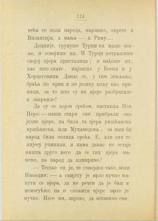 — Тешко ти је, те говориш тако, вели Никодим: — а свијету је врло мучно манути се вјера, да не речем да је баш и немогућно: па и сложити вјере врло је мучно. Него ми, лијепо, да оставимо сваком
